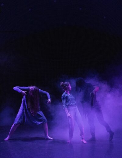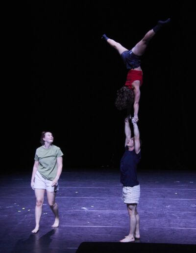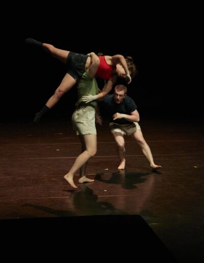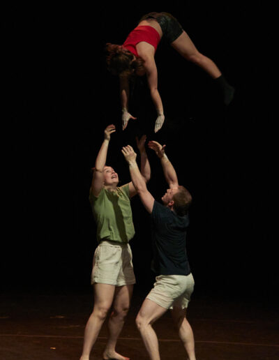 Gefühle innerer Zerrissenheit stehen neben Momenten von Harmonie und Leichtigkeit. Erschöpfung trifft auf vorsichtige Regeneration und Freude. Die drei Artist*innen umkreisen sich, bewegen sich langsam und schnell, fliegen, stürzen, tragen sich gegenseitig und wirbeln durch den Raum. Die Gruppe wird zeitweise zur schützenden Gemeinschaft, dann wieder zur bedrohlichen Einheit.