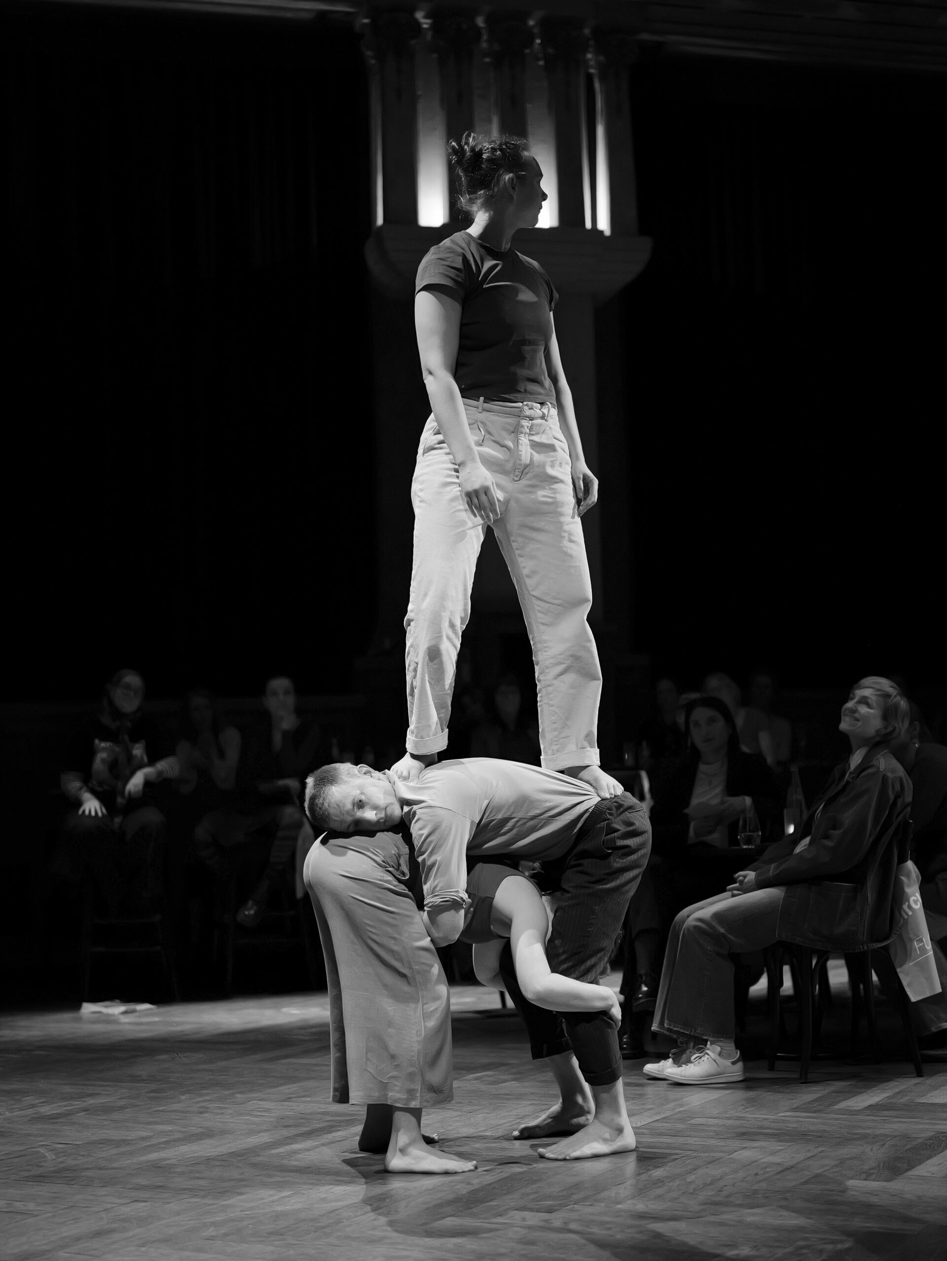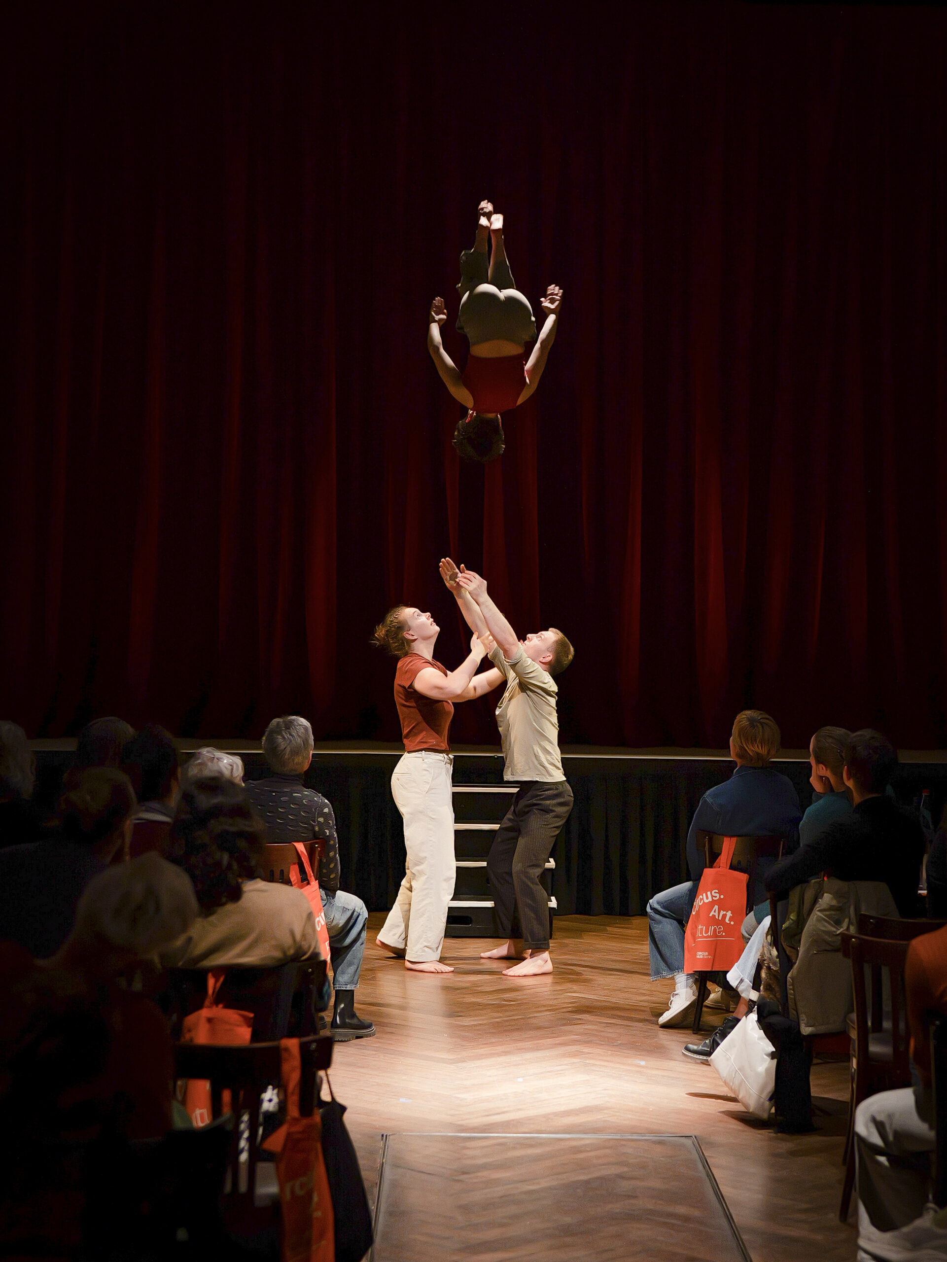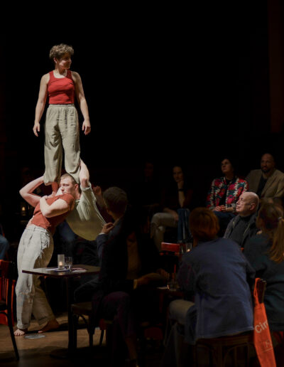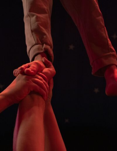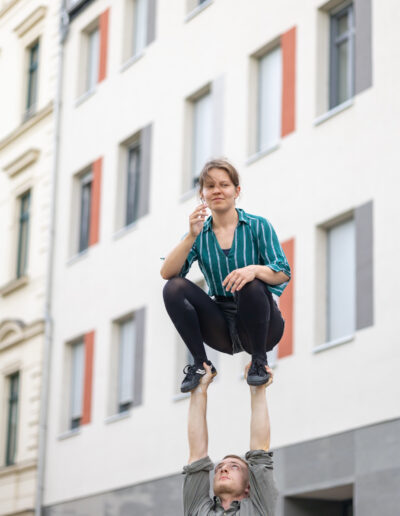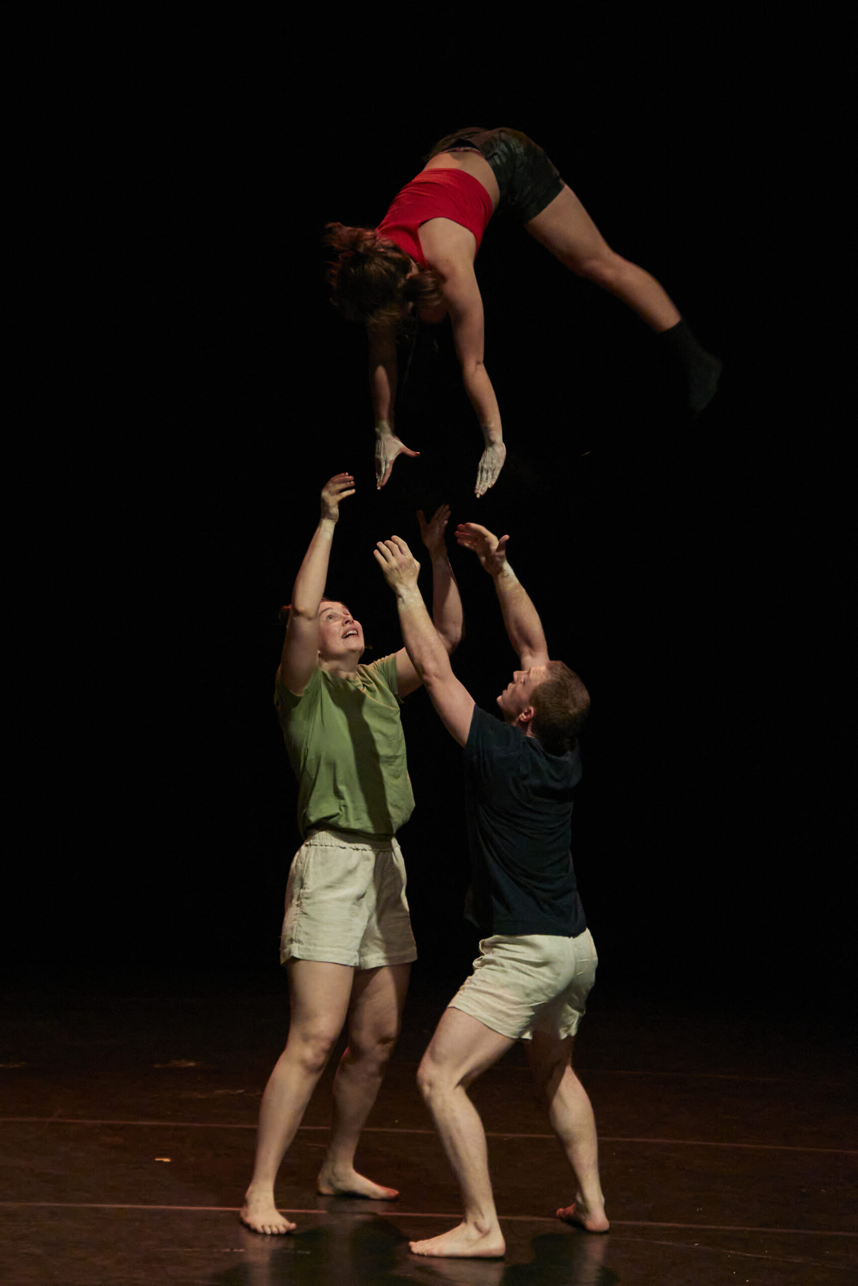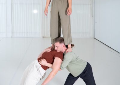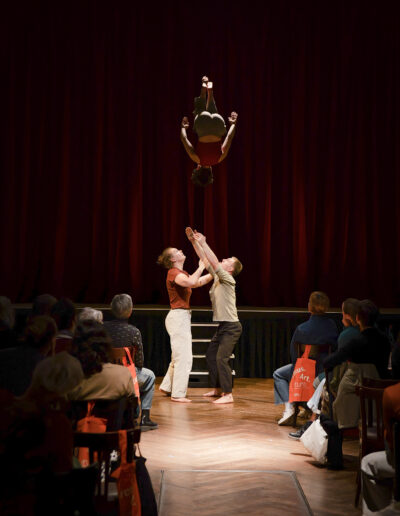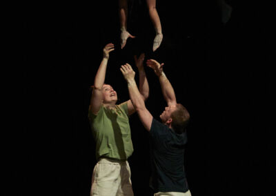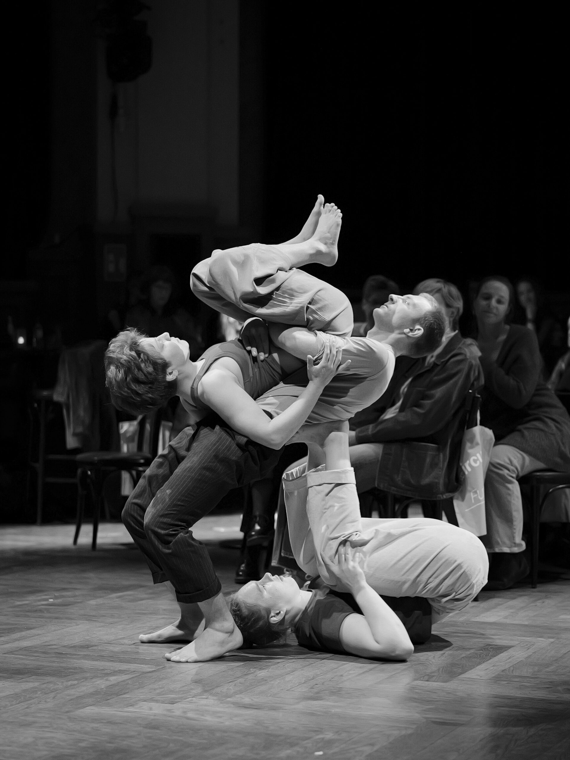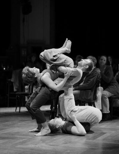 In einem erweiterten choreografischen Prozess erforscht das Trio weitere Bewegungsqualitäten und Dynamiken, die das emotionale Erleben verdichten: Momente des Durchhaltens und Nachgebens, des Suchens und Verlierens, der Nähe und des Abdriftens. Trioakrobatik, fließende Übergänge, Elemente aus Tanz und Theater formen Bilder, die innere Vorgänge physisch greifbar machen und Raum für eigene Assoziationen öffnen.