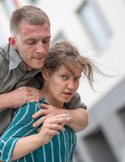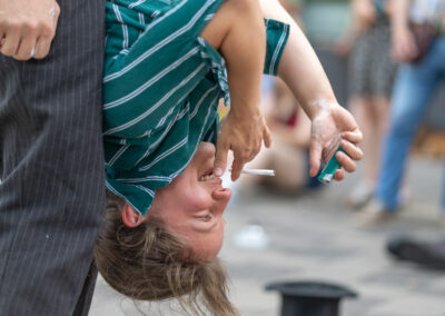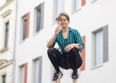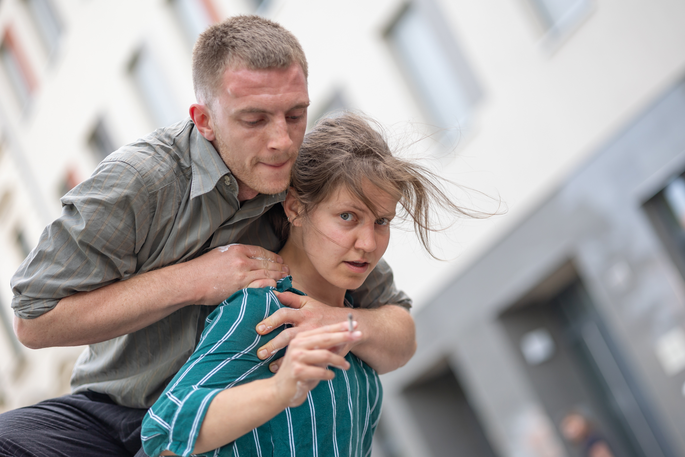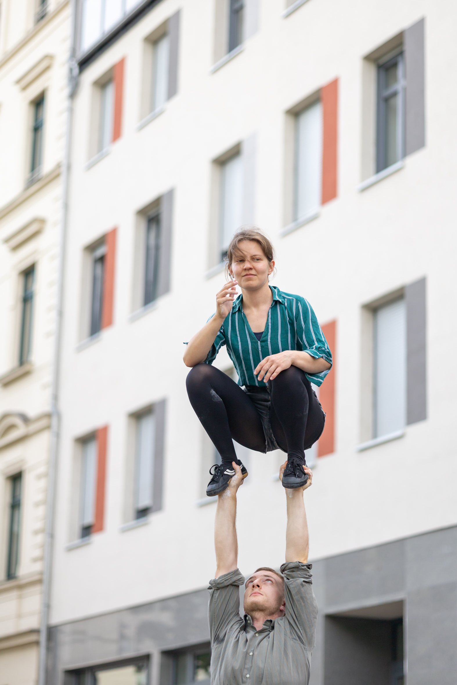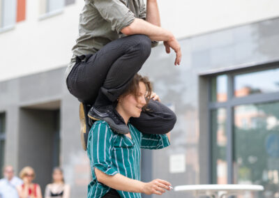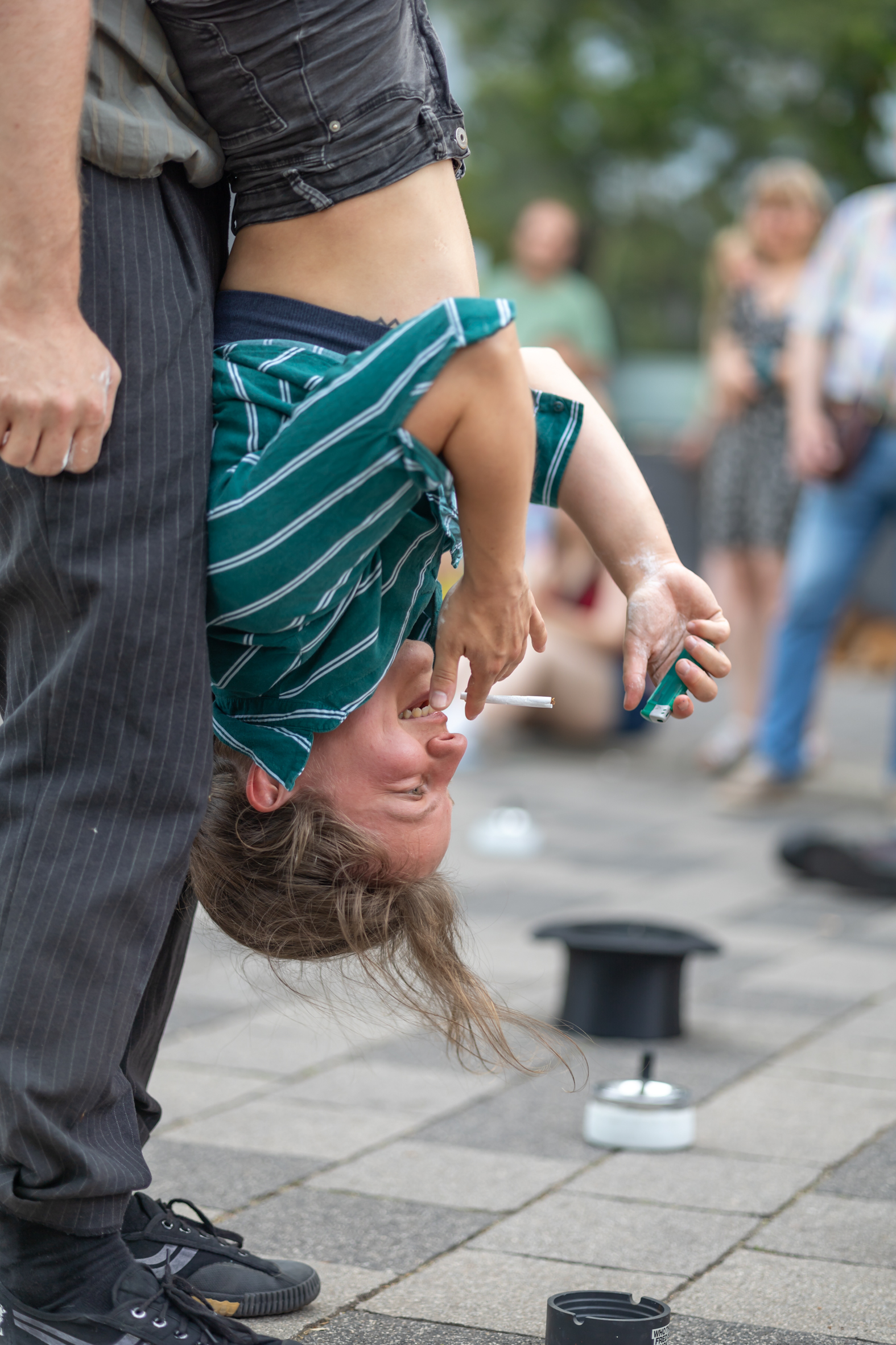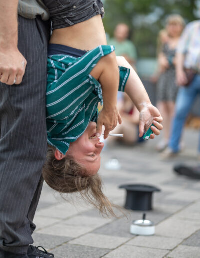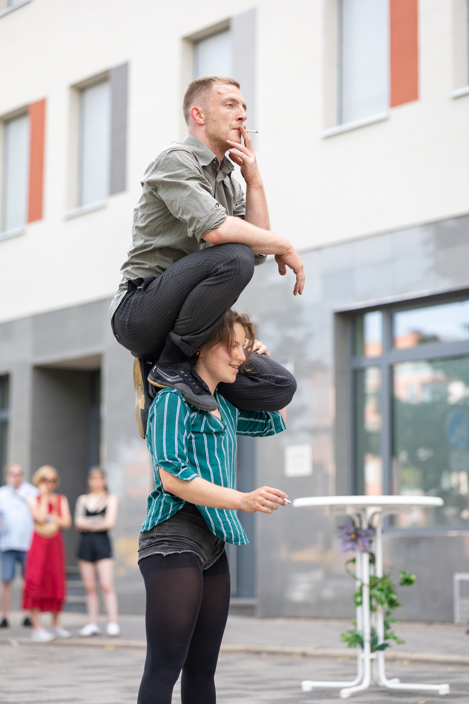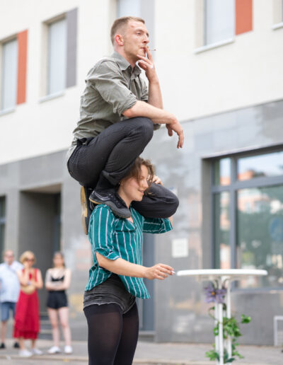 Ob man das Rauchen nun mag oder verabscheut, kaum jemand kann leugnen, dass dem Rauchen eine gewisse Ästhetik innewohnt. Genau mit dieser Ästhetik spielen Fred und Cigdem von Triority Circus in ihrer zehnminütigen Straßenshow. Sie verbinden den sinnlichen, manchmal provokativen Gestus des Rauchens mit der Dynamik und Eleganz der Partnerakrobatik – eine ungewöhnliche Kombination, die überrascht, irritiert und fasziniert.